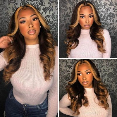 Highlight Brown Body Wave Wig Human Hair Lace Front With Dark Roots 180% Density