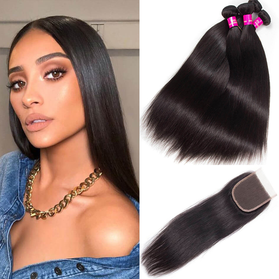 Indian Yaki Straight Hair 4 Bundles With Closure 10A Virgin Kinky Straight Human Bundles With Closure