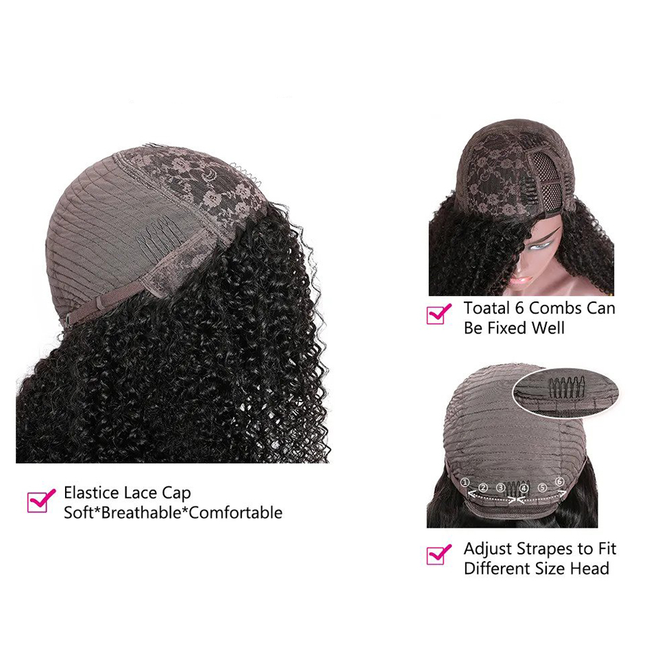 A1: It features a U part opening on the right side for easy blending and styling versatility, creating a natural curly look without lace or glue.